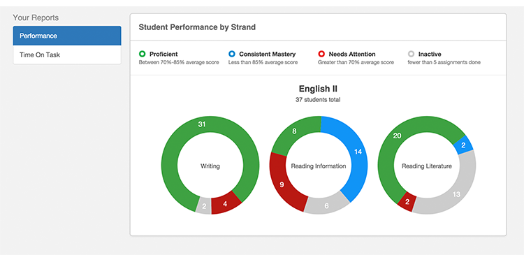 ThinkCERCA's new Insight dashboard give you a bird's eye view of student performance and time-on-task across classes (teachers), schools and districts (administrators). You can now track how students, in aggregate, are performing on reading information standards, writing standards, and reading literature standards. Orange indicates how many students need attention (less than a 70 percent average score on lessons); yellow indicates how many students are demonstrating proficiency across lessons (between a 70 percent and 85 percent average score on lessons); blue indicates how many students are demonstrating consistent mastery (above an 85 percent average score on lessons); and gray indicates how many students are inactive (fewer than five assignments have been completed). Our time-on-task dashboard shows the average time spent in minutes on lessons across classes and grades.