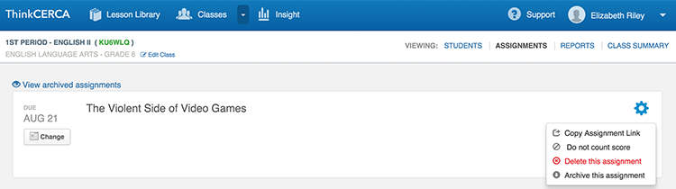 You can now delete and archive lessons by clicking the Assignments link under the Classes navigation menu or Your Classes page. Once you've navigated to the Assignments page, you'll see a complete list of lessons you've assigned to that class. Simply click the gears icon associated with that lesson to delete or archive an assignment. Here, you can also copy an assignment link to post to your class LMS or website or mark the assignment as one that shouldn't count towards your students' scores.
